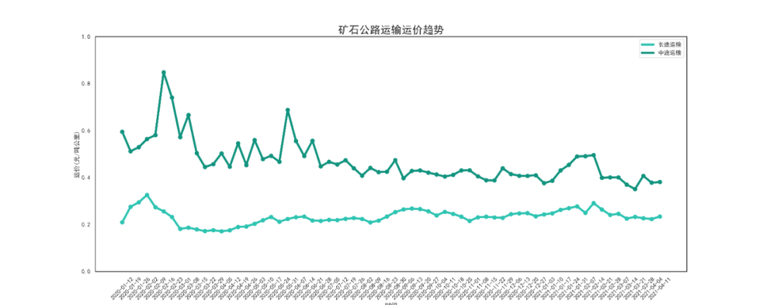 本周矿石长途运输运价为0.236元/吨公里,较上周上涨了0.01元/吨公里,涨幅为4.4%。中途运输运价为0.381元/吨公里,较上周上涨了0.002元/吨公里,涨幅0.5%。