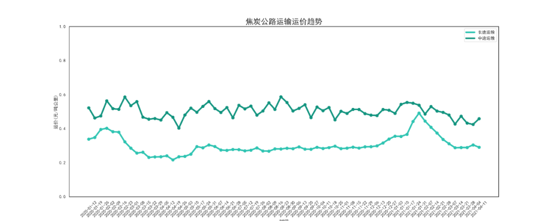 本周焦炭长途运输运价为0.291元/吨公里,较上周下降了0.008元/吨公里,降幅2.7%。中途运输运价为0.459元/吨公里,较上周上涨了0.034元/吨公里,涨幅8%。