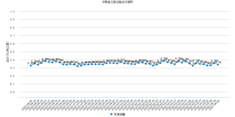 本周河南省公路运输运价为0.34元/吨公里,较上周下降了0.019元/吨公里,下跌5.3%。河南省上周涨幅较大,本周虽是下降,但是只是根据市场环境回调。市场上存在的需求量大,出货量少的情况,也对省内的价格有一定影响。
