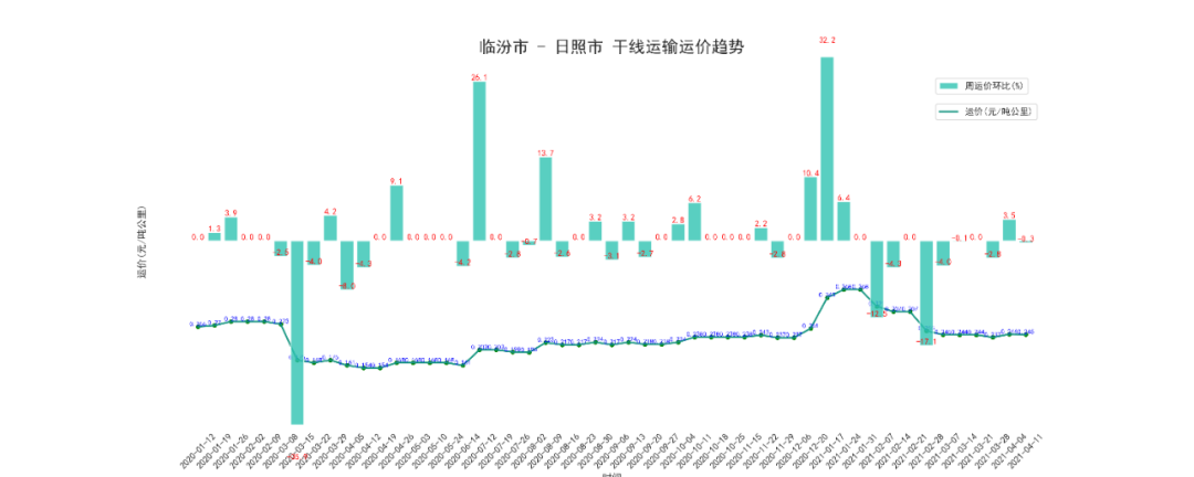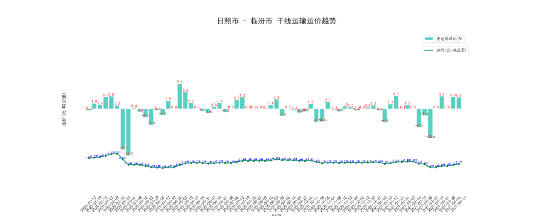 本周日照至临汾干线周平均价为121.13元/吨,按公里数折算为为0.17元/吨公里,上涨了4.2%。