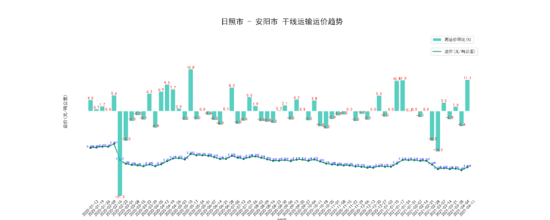本周日照至安阳干线周平均价为78.62元/吨,按公里数折算为0.169元/吨公里,上升了11.1%。