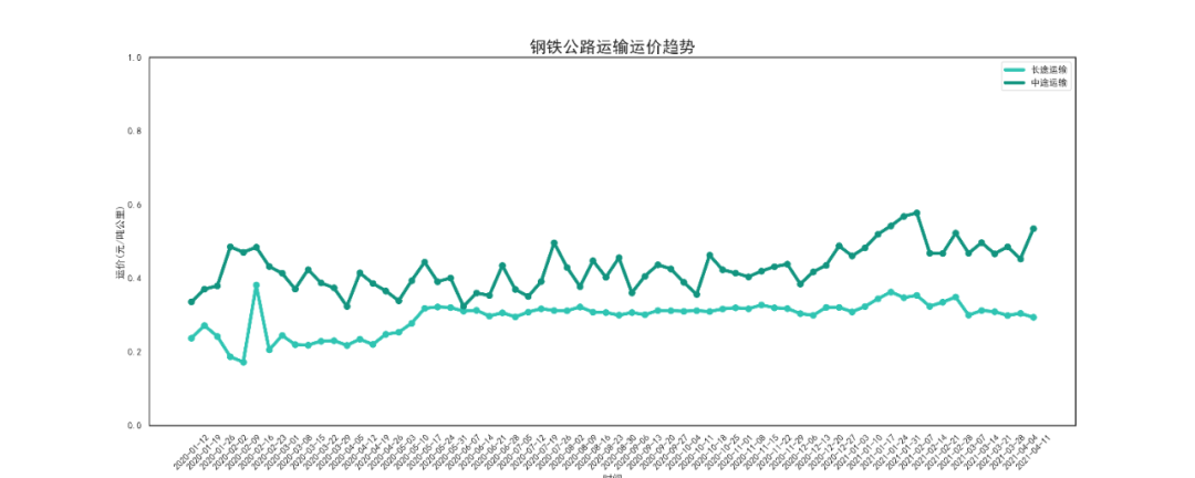 本周钢铁长途运输运价为0.294元/吨公里,较上周下降了0.009元/吨公里,降幅3%。中途运输运价为元0.537/吨公里,较上周上涨了0.081元/吨公里,涨幅17.8%。