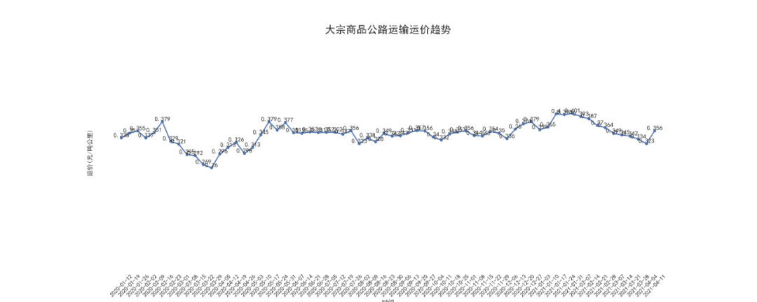 根据物泊科技数据显示,本周大宗商品公路运输运价为0.356元/吨公里,上涨了0.033元/吨,涨幅10.2%,价格回升,结束九连降。
