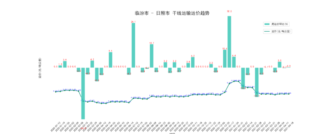 本周临汾至日照干线周平均价为180元/吨,按公里数折算为0.246元/吨公里,上升了0.3%。