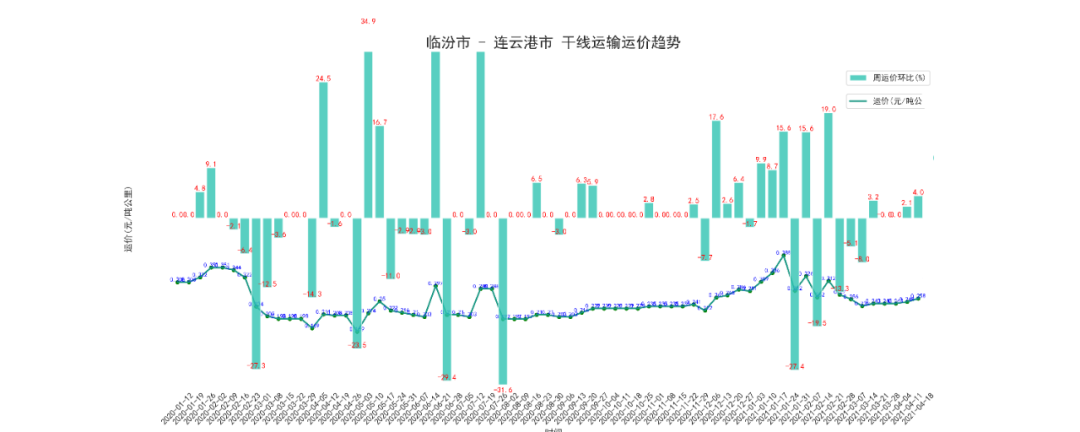 本周临汾至连云港干线周平均价为187.59元/吨,按公里数折算为0.258元/吨公里,上升了4%。