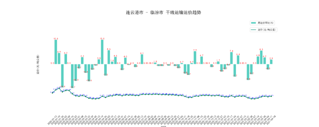 本周连云港至临汾干线周平均价为120.89元/吨,按公里数折算为0.171元/吨公里,上升了2.9%。