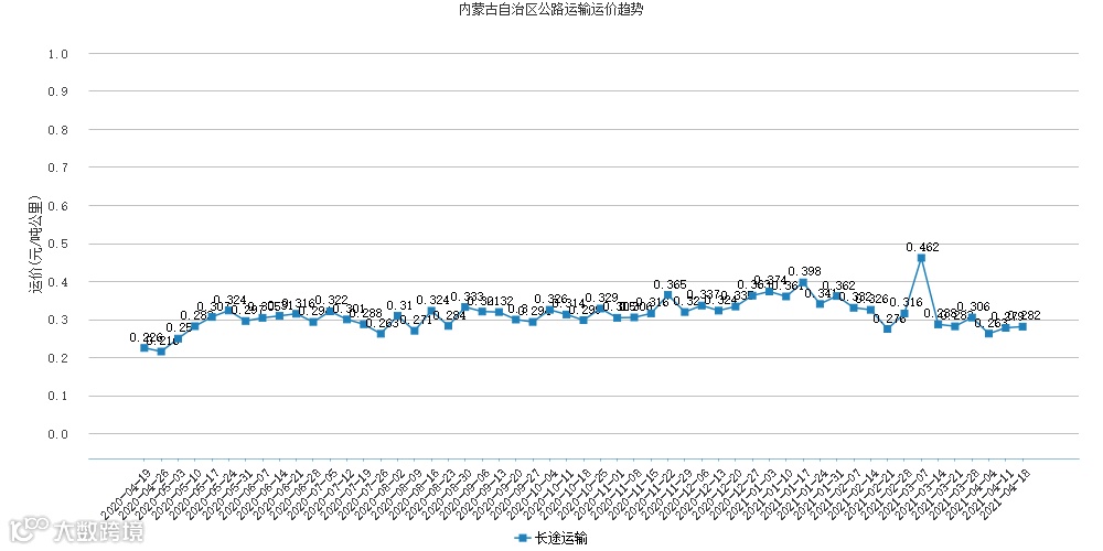 本周内蒙古公路运输运价为0.282元/吨公里,较上周上涨了0.003元/吨公里,上升1.1%。