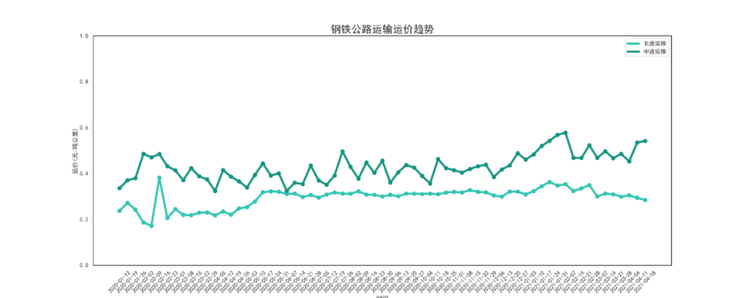 本周钢铁长途运输运价为0.283元/吨公里,较上周下降了0.011元/吨公里,降幅3.7%。中途运输运价为元0.554/吨公里,较上周上涨了0.016元/吨公里,涨幅3.1%。