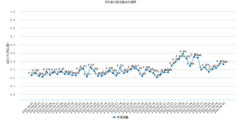 本周河北省公路运输运价为0.366元/吨公里,较上周下降了0.005元/吨公里,下跌1.3%。