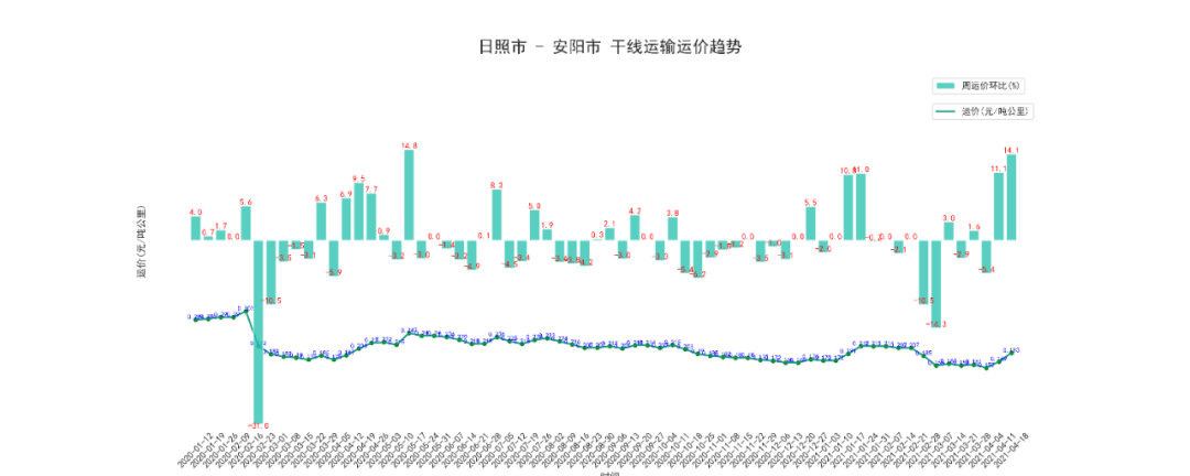 本周日照至安阳干线周平均价为89.18元/吨,按公里数折算为0.193元/吨公里,上升了14.1%。