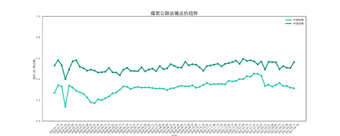 本周煤炭长途运输运价为0.315元/吨公里,较上周下降了0.004元/吨公里,降幅1.3%。中途运输运价为0.57元/吨公里,较上周上涨了0.031元/吨公里,涨幅5.7%。