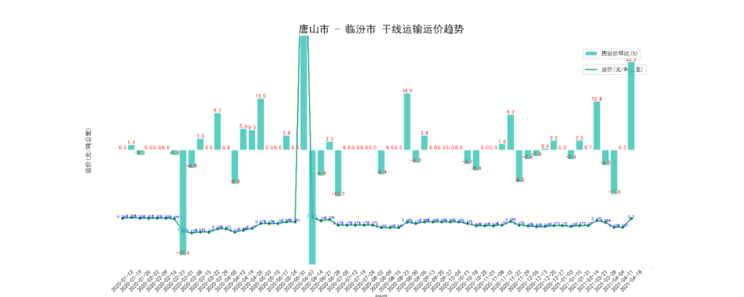 本周唐山至临汾干线周平均价为149.98元/吨,按公里数折算为为0.2元/吨公里,上涨了23.2%。