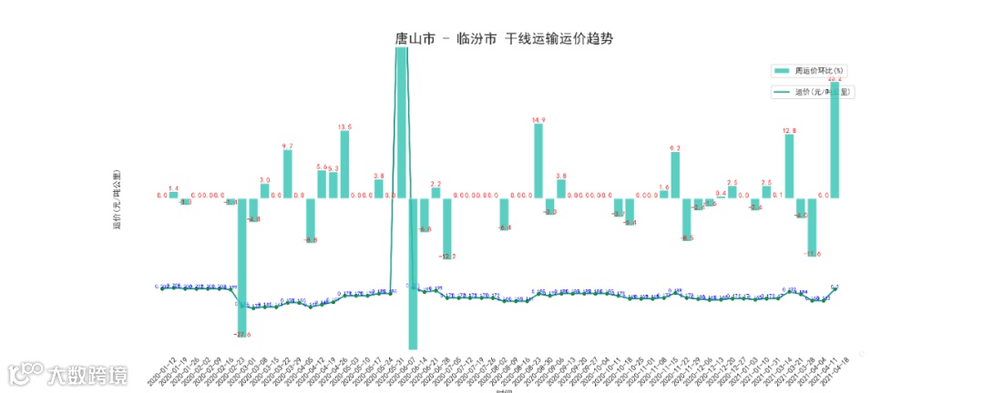 本周临汾至唐山干线周平均价为173.36元/吨,按公里数折算为0.269元/吨公里,上涨8%。