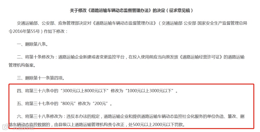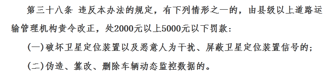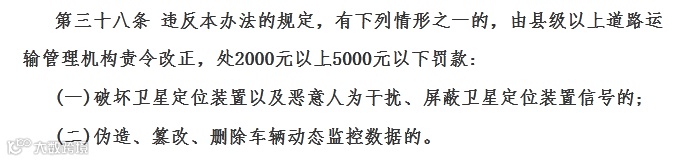 目前的管理办法规定,破坏卫星定位装置以及恶意人为干扰、屏蔽卫星定位装置信号,或伪造、篡改、删除车辆动态监控数据,处2000元以上5000元以下罚款。而征求意见稿将上述违规行为的处罚额度,降低为500元以上2000元以下。