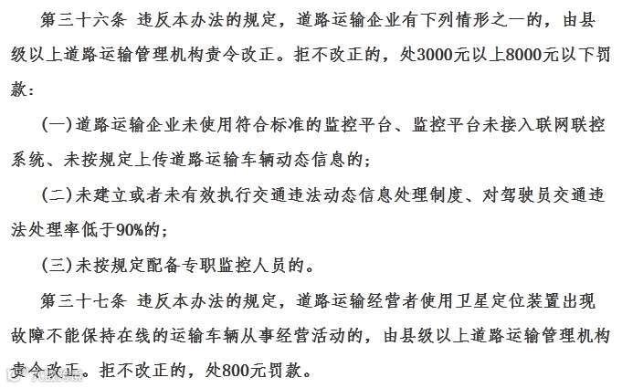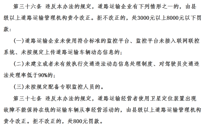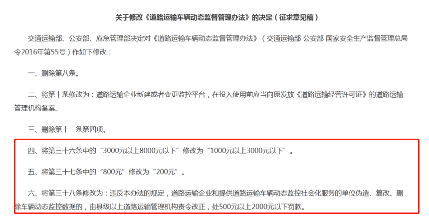 道路运输企业未使用符合标准的监控平台、监控平台未接入联网联控系统、未按规定上传道路运输车辆动态信息的、未按规定配备专职监控人员等违规行为,可被处罚3000元以上8000元以下罚款。征求意见稿将罚款额度修改为1000元以上3000元以下。