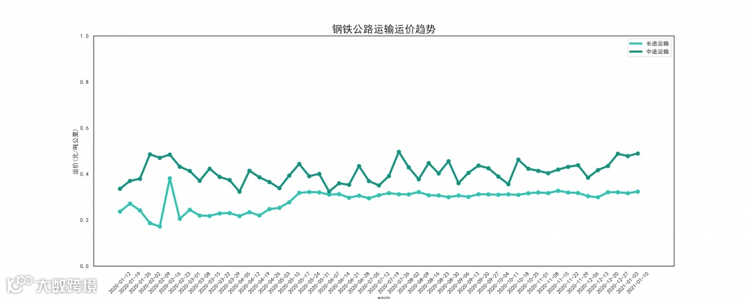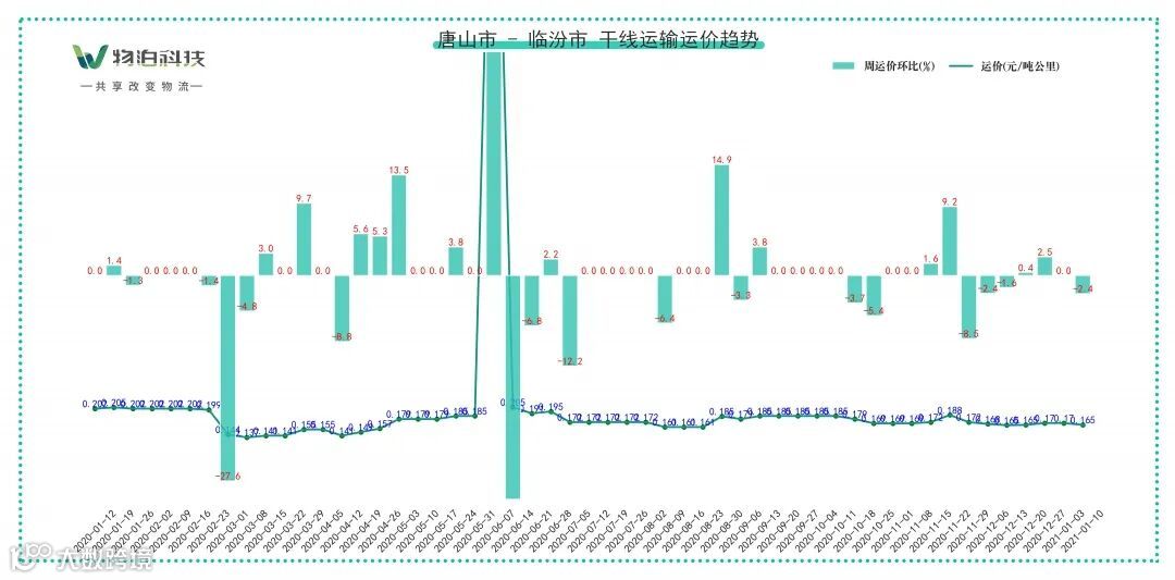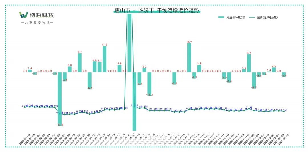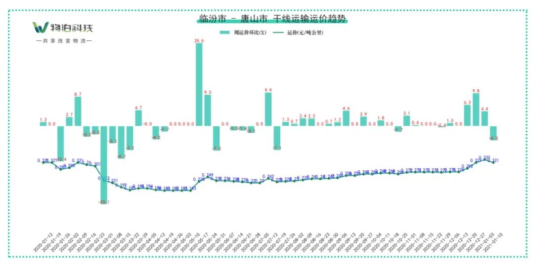 本周临汾至唐山的干线运输运价为0.321元/吨公里,下跌了4.3%,持续了两个月的上涨,在本周首次下跌。