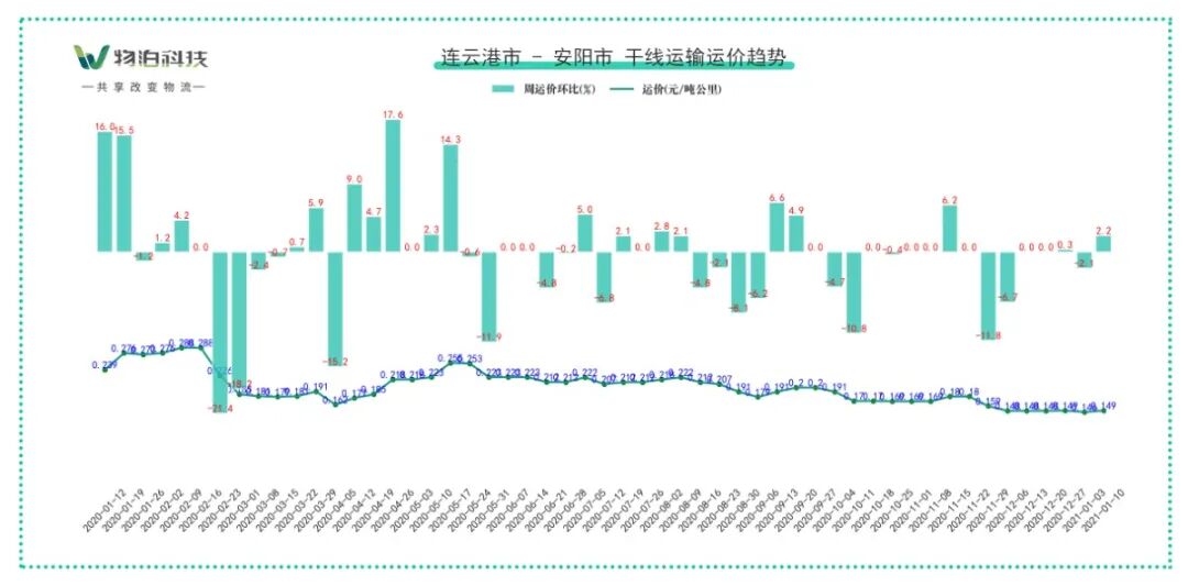 本周安阳至连云港的干线运输运价为0.271元/吨公里,上涨了0.02元/吨公里,涨幅为8.1%,运价处于波动状态。