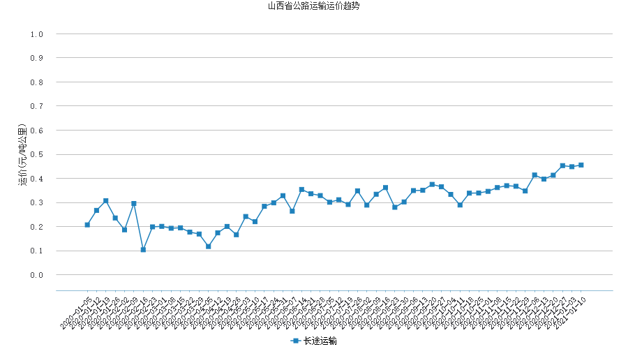 本周 山西省公路运输运价为0.455元/吨公里,较上周上涨了0.007元/吨公里,山西省的公路运输运价已经达到了一个峰值,因此上涨的幅度较小,开始逐渐趋于稳定。