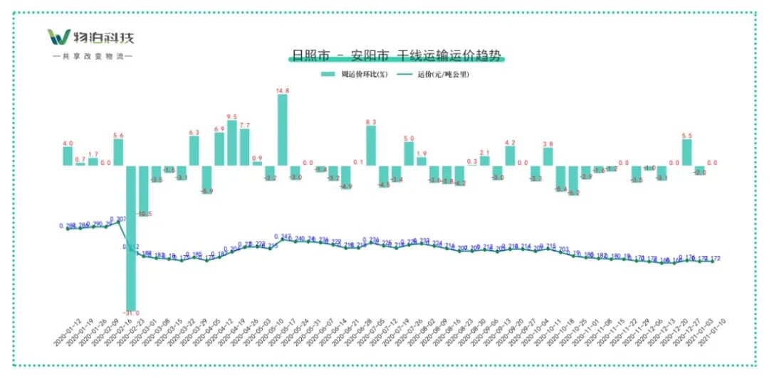本周日照至安阳的干线运输运价为0.172元/吨公里,与上周持平,运价趋于稳定。