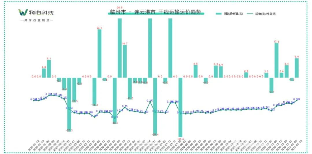 本周临汾至连云港的干线运输运价为0.309元/吨公里,上涨了0.28元/吨公里,涨幅为9.9%,本周涨幅较显著。