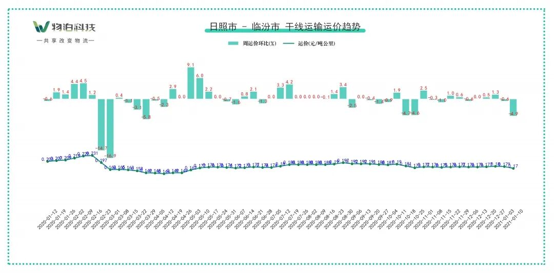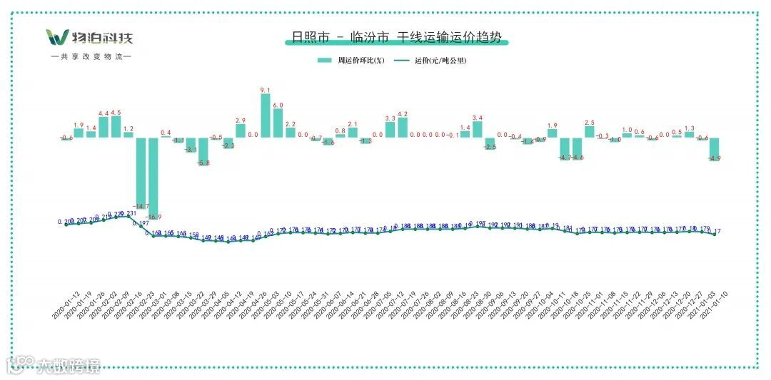 本周日照至临汾的干线运输运价为0.170元/吨公里,下跌了0.009元/吨公里,跌幅为4.9%,运价有了较为显著的波动。