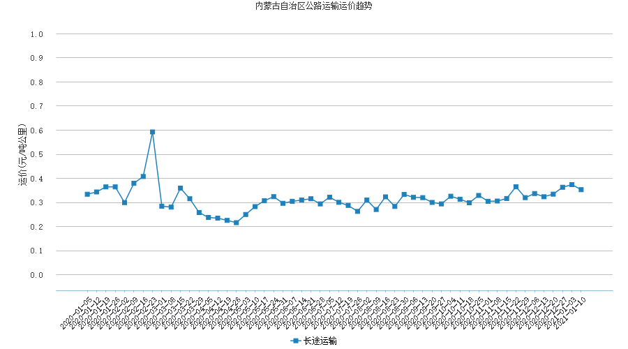 本周内蒙古公路运输运价为 0.353元/吨公里,较上周下降了0.02元/吨公里,下跌幅度较小。