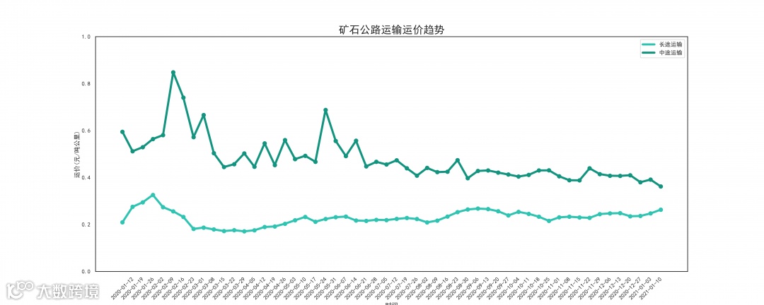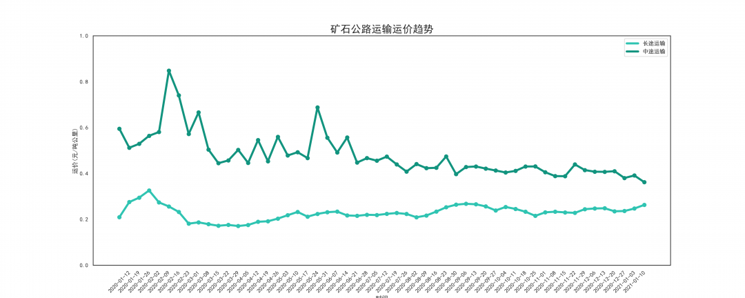 本周矿石公路运输运价0.263元/吨公里,较上周上涨了0.005元/吨公里,延续了上涨势头,逐步逼近全年运价最高点。