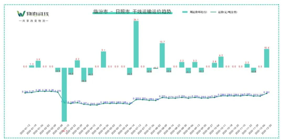 本周临汾至日照的干线运输运价为0.261元/吨公里,上涨了0.24元/吨公里,涨幅为10.4%,本周上涨幅度较大。