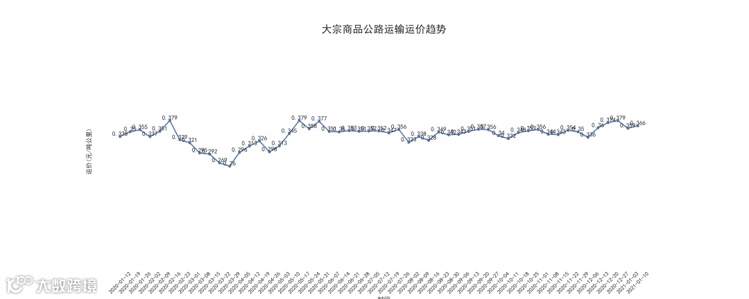 本周的大宗商品公路运输运价为0.366元/吨公里,较上周上涨了0.007元/吨公里,第二轮的寒冷天气已经袭来,公路物流运输压力增大,运价也得到了相应提升。