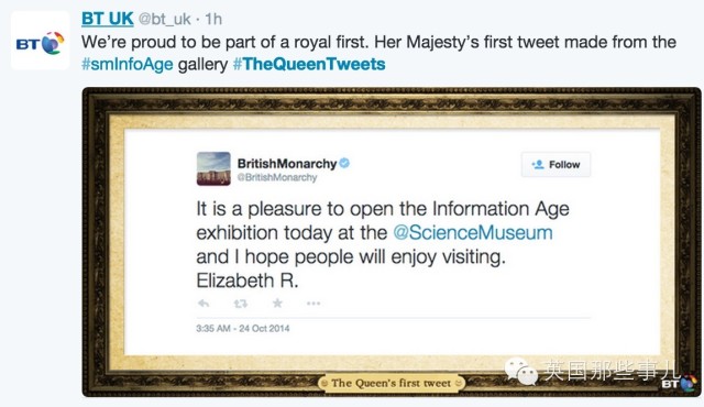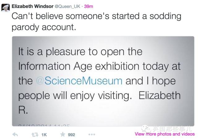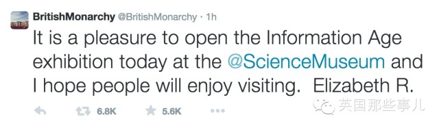 为了祝贺伦敦科学博物馆"信息时代"主题展的开幕,女王今天专门来到了这里,在ipad上用英国皇室的账号发出了这条推文。