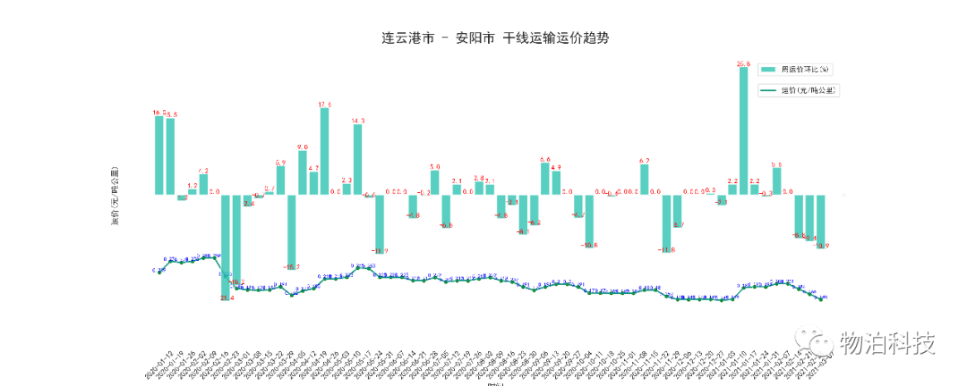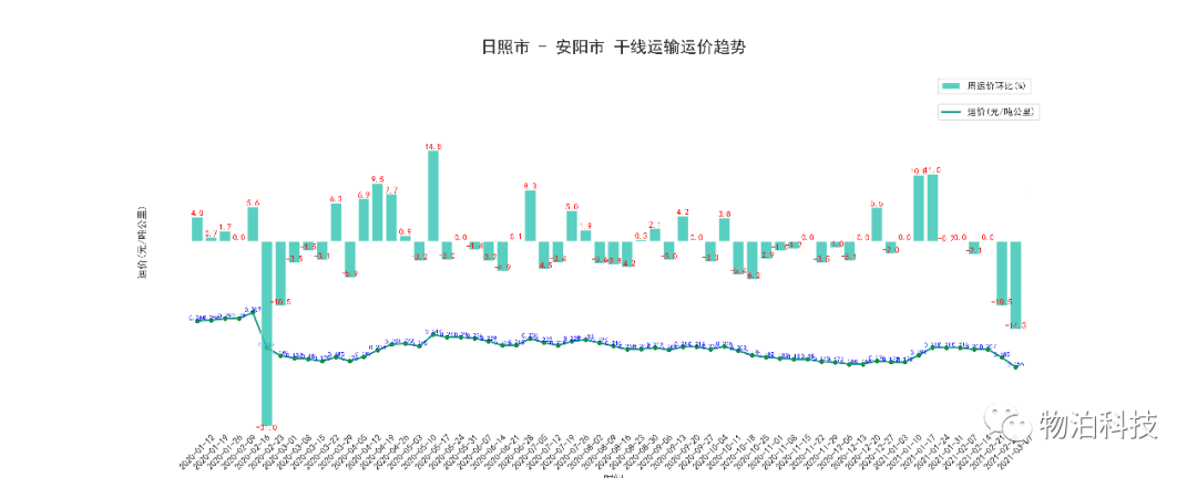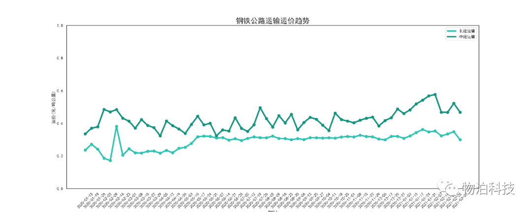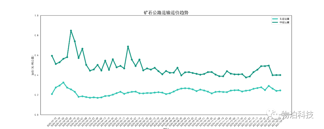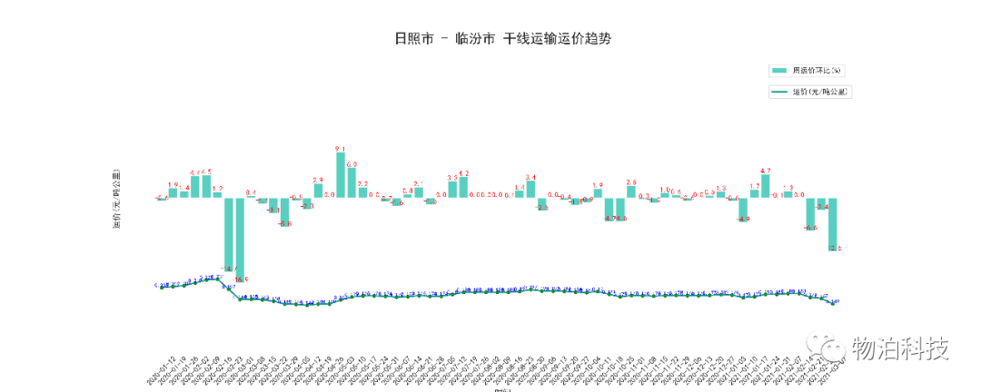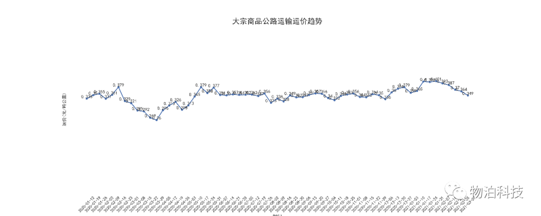 根据物泊科技数据显示,本周大宗商品公路运输运价为0.349元/吨公里,相比上周降了0.015元/吨,但随着疫情形势好转,世界范围内经济将继续恢复,又加上近期两会的各种政策的推行落地,止跌企稳还是指日可待,相信3月中下旬开始运价会迎来良好的转势 。