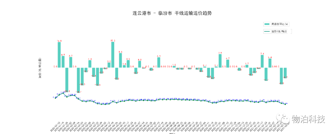 本周临汾至连云港干线周平均价为208.18元/吨,按公里数折算为0.256元/吨公里,下跌了5.1%。