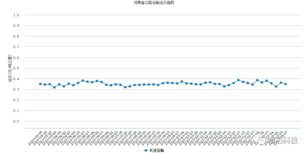 本周河南省公路运输运价为0.35元/吨公里,较上周下跌了0.0133元/吨公里,下降3.6%。