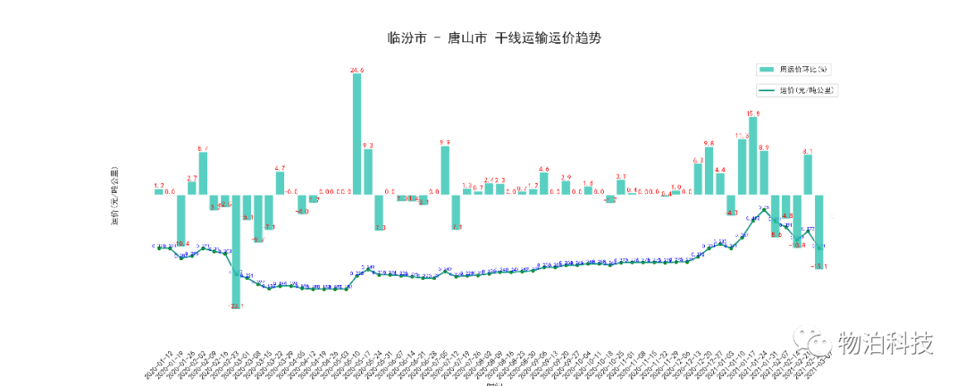 本周临汾至唐山干线周平均价为246.94元/吨,按公里数折算为0.321元/吨公里,下降了15.1%。