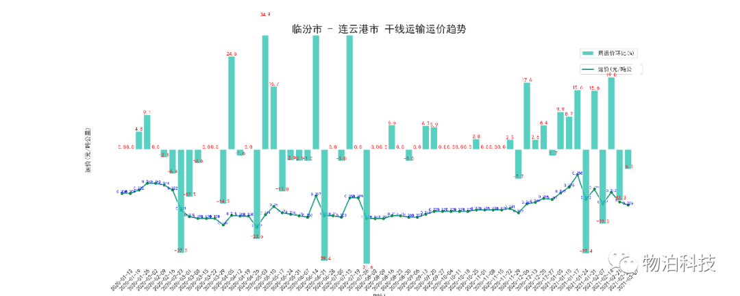 本周连云港至临汾干线周平均价为121.27元/吨,按公里数折算为为0.146元/吨公里,较上周下跌了6.2%。