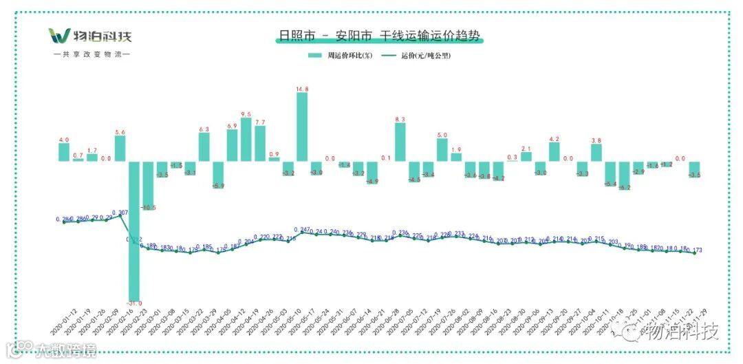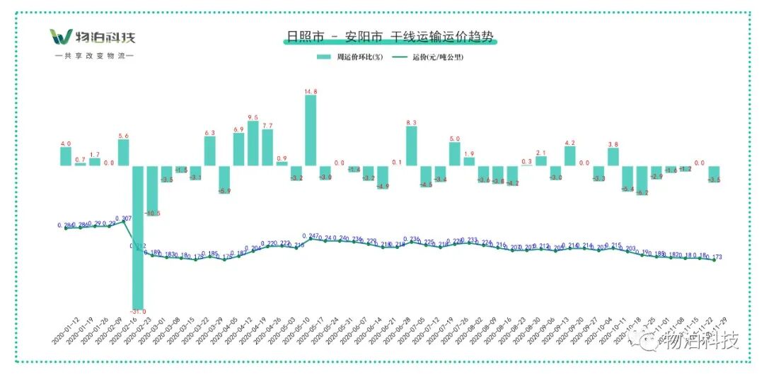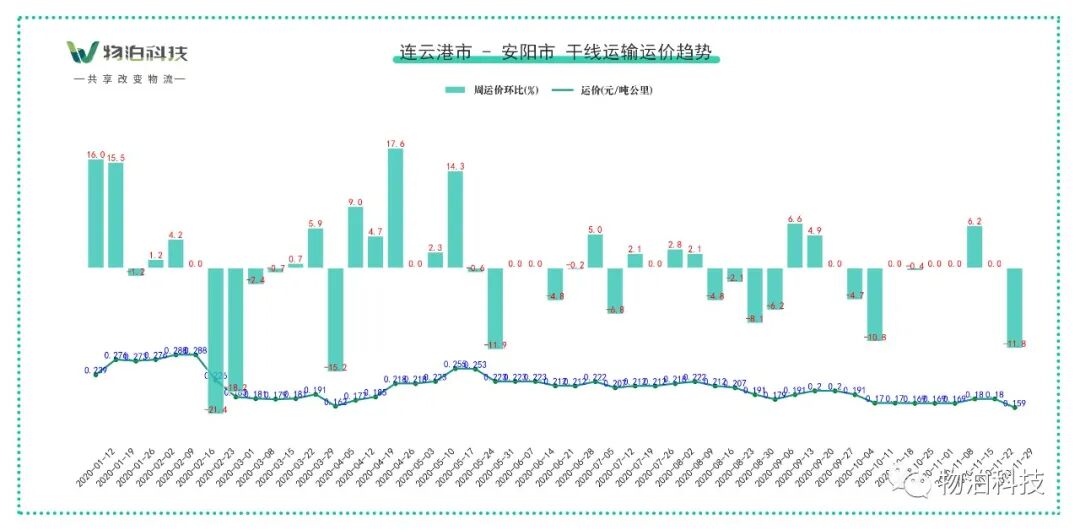 本周,连云港——安阳干线运输运价在0.159元/吨公里,上周0.18元/吨公里本干线本周运价下跌明显,降幅为11.8%。
