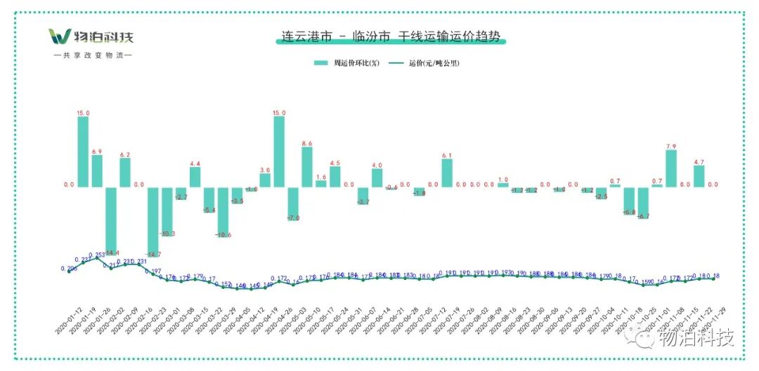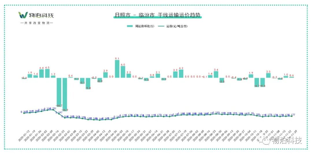 上周,日照——临汾干线运输运价在0.177元/吨公里,环比上涨0.6%。