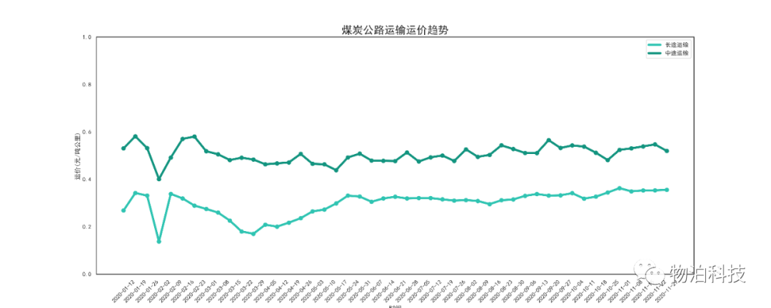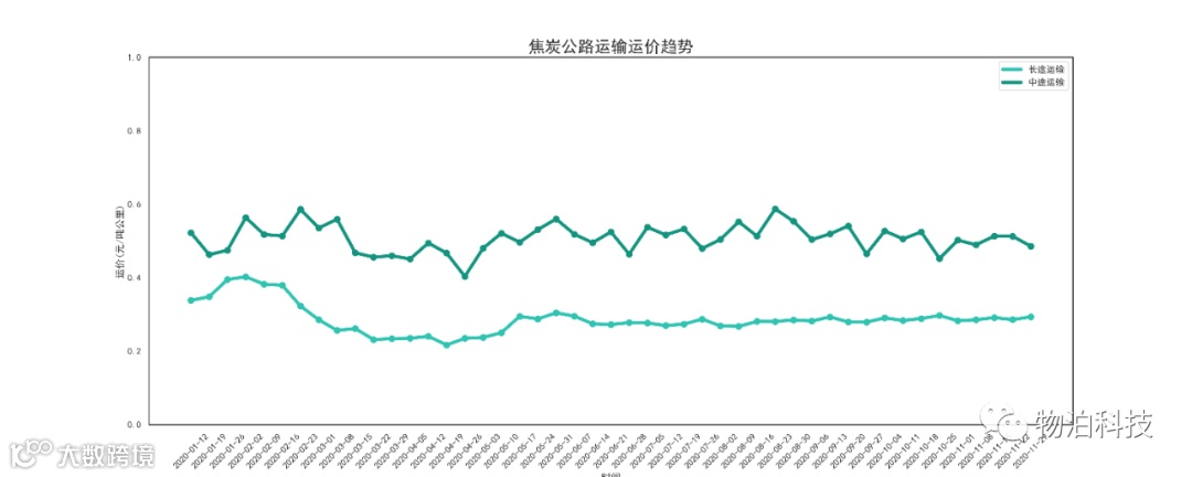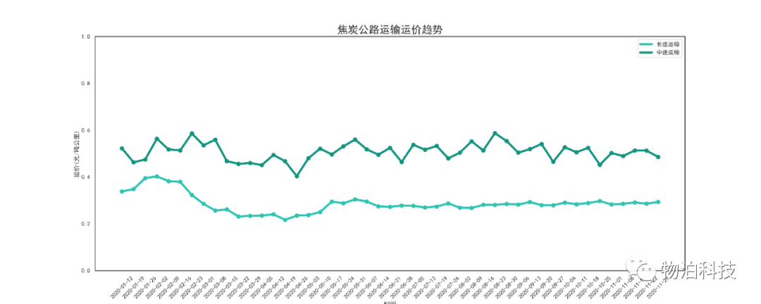 大宗商品货运价分品种来看,矿石钢铁中途(50-200公里)运输运费上涨,长途运输(大于200公里)运费下降。煤炭焦炭则相反,中途运输下降,长途运输上涨。
