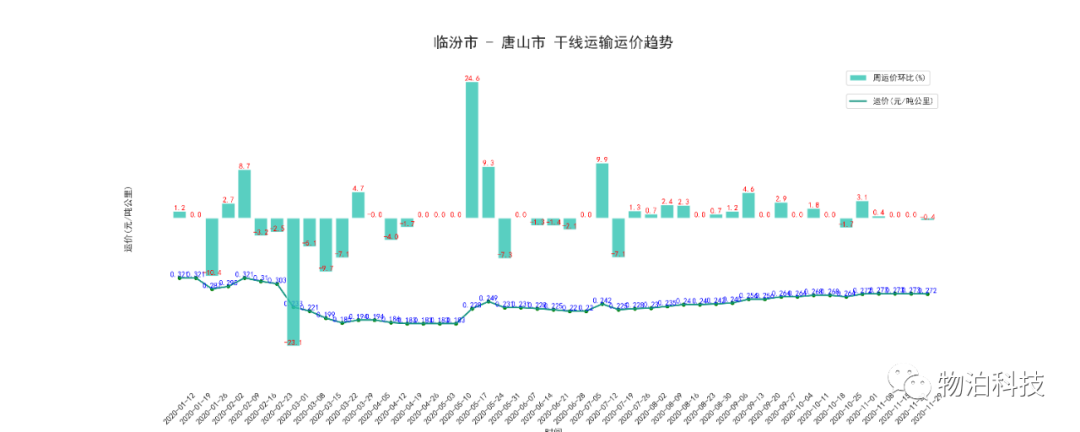 本周,临汾——唐山干线运输运价在0.272元/吨公里,比上周微跌0.4%。近来,本干线运输价格趋于稳定,基本维持在0.273元/吨公里小幅震荡。