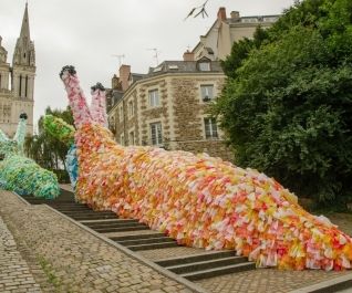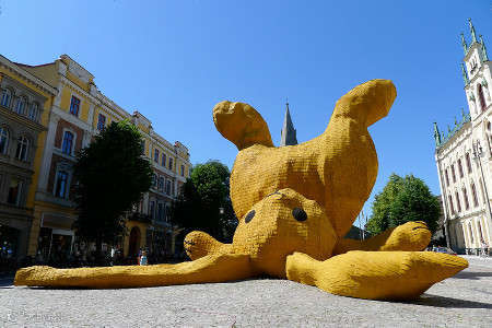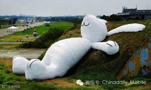 据台湾媒体报道,"大黄鸭"之父、荷兰艺术家霍夫曼打造的又一新作——大白兔,4日亮相台湾桃园地景艺术节。这只白兔名叫"月兔",在蓝天绿草的衬托下犹如一只来自爱丽丝仙境的真实版兔子。据报道,"月兔"长约25米,是由防水纸、木头以及泡沫塑料做成的,不怕日晒雨淋,不过台风是它的天敌。霍夫曼的作品一贯将小动物"极大化",意在给观赏者创造出幸福感,此次"月兔"是从中国嫦娥与玉兔的传说中汲取了灵感。