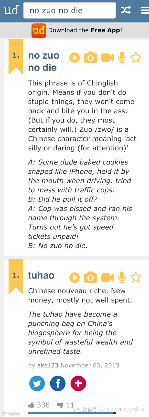 除了媒体,另一条向英文读者介绍中文新词的重要途径是一个稍稍有点恶搞意味的网站urbandictionary.com。这个网站专门介绍英文俚语,任何人都可以提交新词,因此出现了许多中文网络流行词,比如tuhao和no zuo nodie。