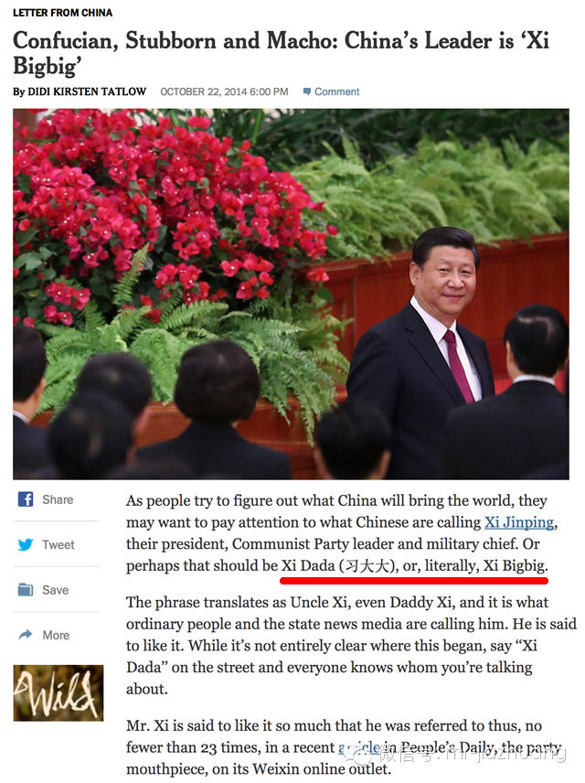 10月22日,《纽约时报》刊登了一篇介绍中国人怎么称呼领导人的文章,开头就说,“想弄清中国到底能给世界带来什么的人们,也许需要注意一下中国人如何称呼他们的国家主席、党领导人和军事统帅:习大大”。