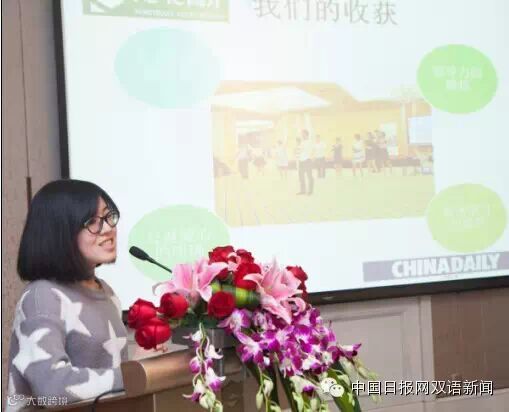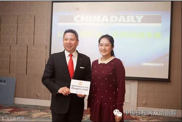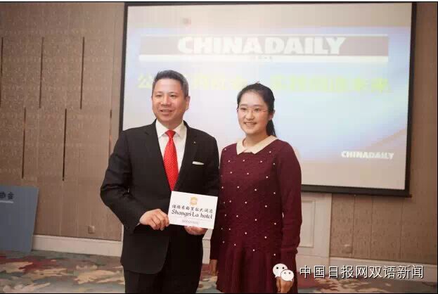 At the end of the summing-up meeting, a mysterious present was given to a volunteer from Liaoning University by Mr. Raymond Teo, General Manager of Shangri-La Hotel, Shenyang. She will work with Mr. Teo for one day.