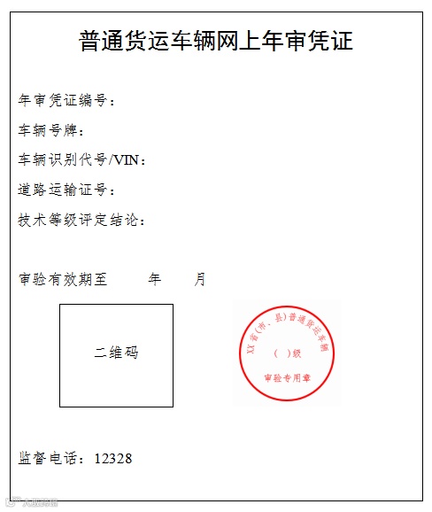 审验符合要求的,道路货物运输经营者可通过全国互联网道路运输便民政务服务系统下载《普通货运车辆网上年审凭证》(参考样式见附件1)并留存。电子印章(参考样式见附件1)标注在《普通货运车辆网上年审凭证》上,由审验机关加盖。