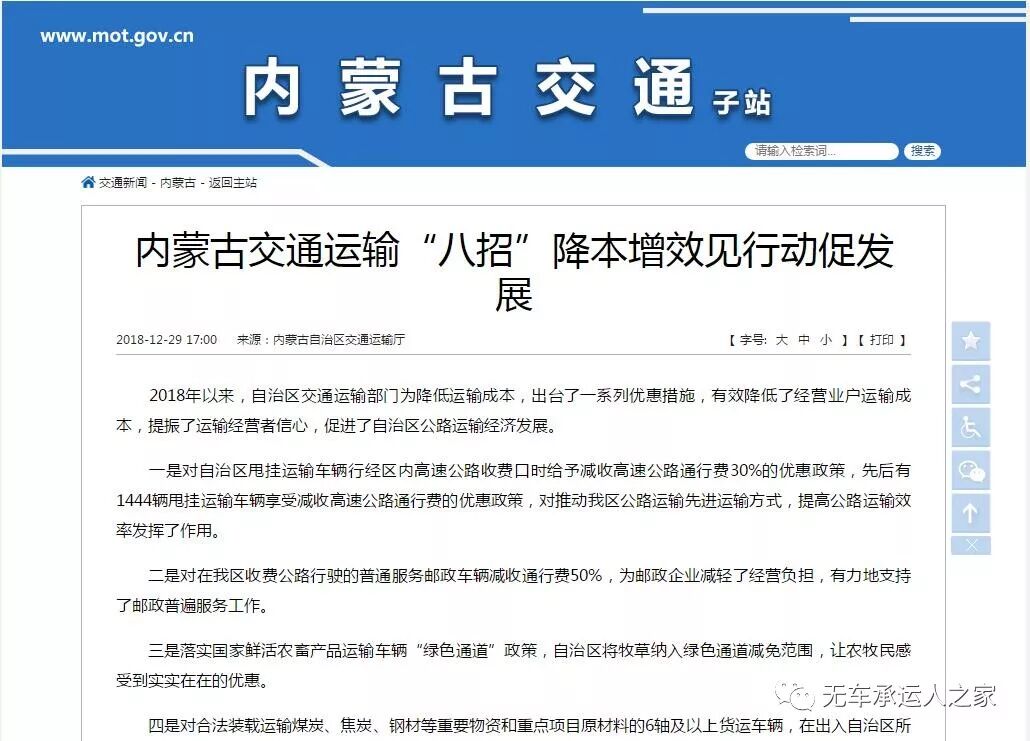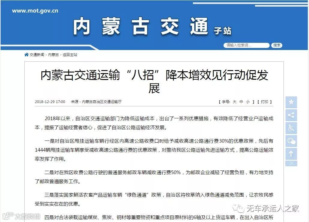 在移动互联网技术与货运物流行业深度融合的背景下,自治区交通运输部门还主动培育无车承运新经营模式,积极开展无车承运人试点工程,这是自治区交通运输部门推动降本增效的第八招。目前,全区已经有69家无车承运人试点企业,这些企业可通过“互联网+”、大数据等信息技术全面整合物流资源、创新运输模式、推进产业融合、服务货车司机,累计整合运力10988辆,完成货运量355.5余万吨,营业额突破2亿元。