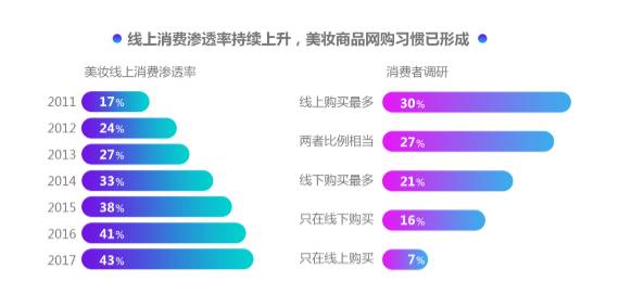 《报告》显示,2011-2017年线上美妆消费渗透率持续上升。宝洁线上销售相比过去增加27%,销售占比33%;联合利华线上占比25%,比线上销售前增长了44%;汉高线上销售占比最高,已达到56%;上海家化也达到44%。