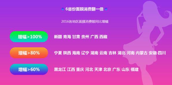 同时,面膜的增势突出。相对于防晒品,面膜本土品牌市场占比可观,且部分地区极具挖潜价值。2016年,帝都北京人拿下了人均面膜消费金额头名,超过上海、天津。27个省(市区)的面膜消费额增速超过60%,其中新疆、青海、甘肃、贵州、广西、西藏的消费额更是翻了一倍,增幅均高于100%。
