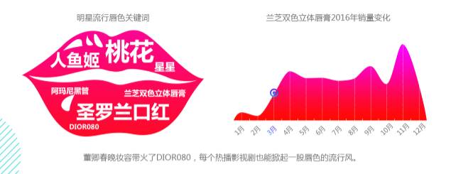 值得关注的是,明星的号召力在唇膏这个品类可见一斑。2016年Dior拿下了年度唇部品牌TOP10头名,而这一成绩的取得背后,与董卿春晚妆容带火了Dior080不无关联。而雅诗兰黛“桃花”唇膏和兰芝双色立体唇膏的热销,也是分别得益于《三生三世十里桃花》、《太阳的后裔》明星网红剧的热播。