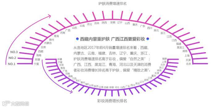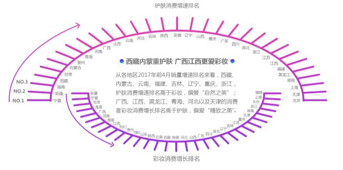 基于美妆用户地图,浙闽渝吉辽藏滇及内蒙护肤消费增速排名高于彩妆,更重“自然之美”;津冀青黑赣桂彩妆消费增速排名高于护肤,更重“精致之美”。