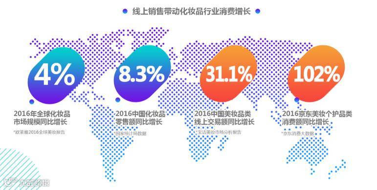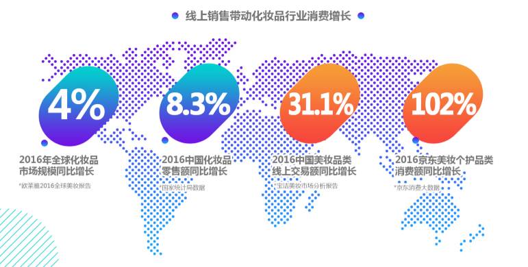 透过数据不难发现,全球美妆市场亮点在中国,而中国美妆市场的亮点又在优质线上渠道。根据欧莱雅2016全球美妆报告,2016年全球化妆品市场规模同比增幅4%,同期国家统计局数据显示, 2016年中国化妆品零售额同比增幅8.3%。然而,相比线上渠道惊人的成长速度,依然是“小巫见大巫”。最新京东大数据显示,2016京东美妆个护销售额同比增幅高达102%。